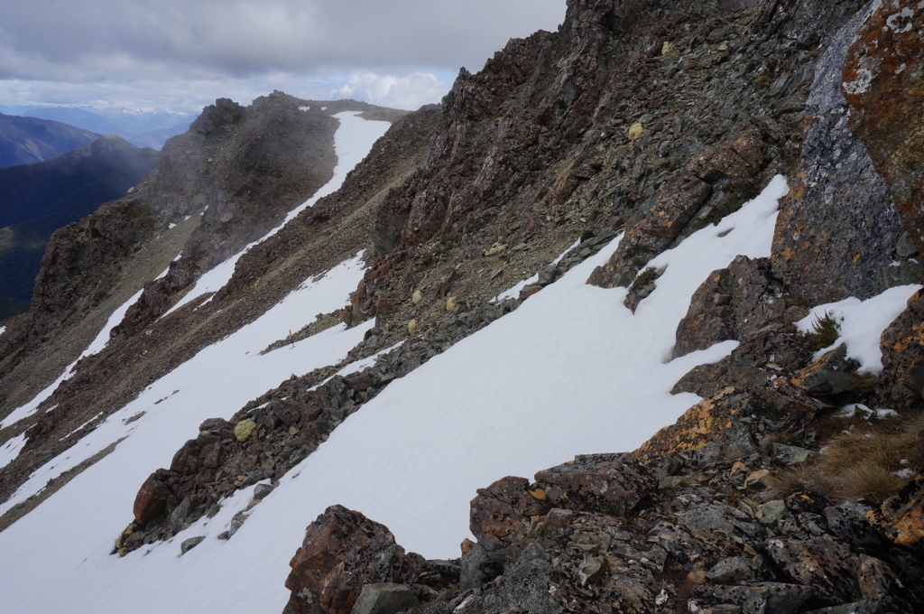 Otrā diena. Laikam skarbākais posms. Taka ved pari šim sniega klajumam. Bet slīpuma dēļ nācās līst pa klintiņām virs sniega.