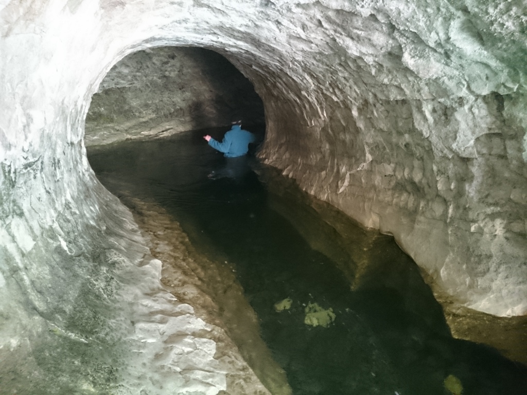 Cave Stream ieeja. Ar džemperi mugurā un cepuri galvā peldam iekšā nezināmajā.