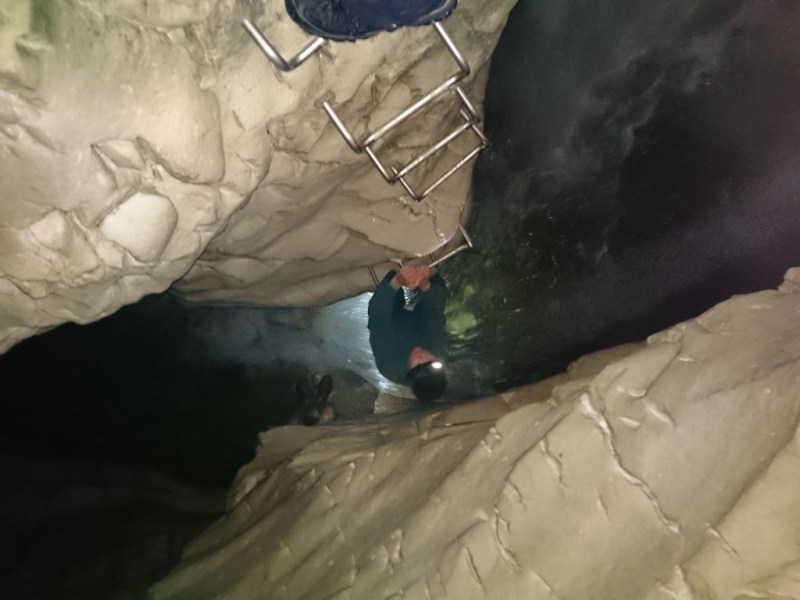 Cave Stream izeja. Īsi pirms iznākšanas virszemē pēdējais izaicinājums – pa metāla pakāpieniem jāuzlien uz klints plaukta blakus 3 metrus augstam ūdenskritumam.