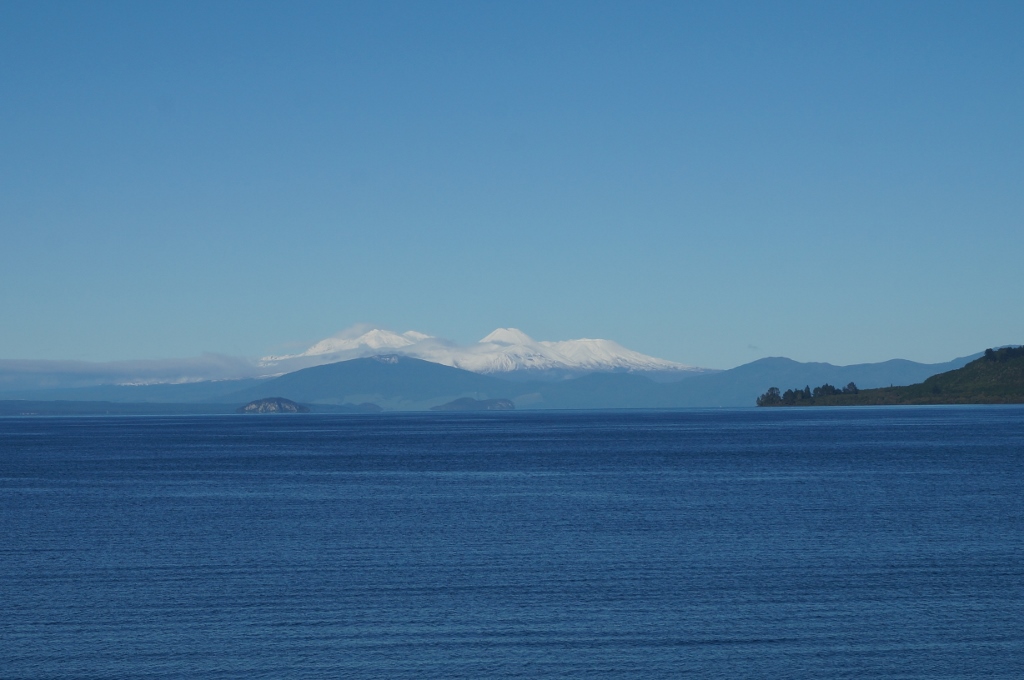 Pāri Taupo ezeram skaidrā laikā redzams šobrīd sniegotais Tongariro.