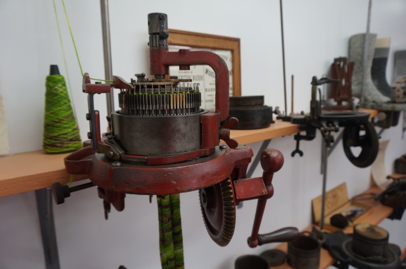 Hokitika – zeķu pilsēta. Veikaliņā ievietota vēsturisko un ne tik vēsturisko zeķu adāmmašīnu kolekcija.