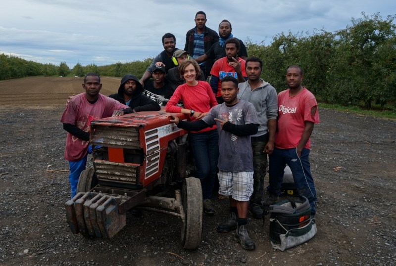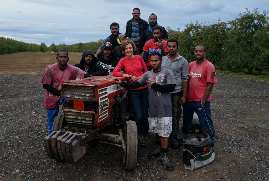 Mana darba komanda. Denis, Basil, Kelson, Peter, Andison, Mosis, traktorists Roberts, Phil, Frexwel, Joseph, Jarrjd. Puiši no Vanuatu salām uz Jaunzēlandi brauc katru gadu. Trīs mēnešus lasa ābolus, trīs mēnešus dara citus darbus un tad pusgadu var atkal pavadīt mājās pie ģimenēm. Vanuatu salās minimālā alga esot 2 dolāri stundā. Šeit 15. Ir atšķirība. Ja dienā spēj salasīt vidēji sešas kastes (reizēm arī deviņas un desmit), tad nopelnītā naudiņa ir iespaidīga, jo par kasti maksā 30 dolārus.