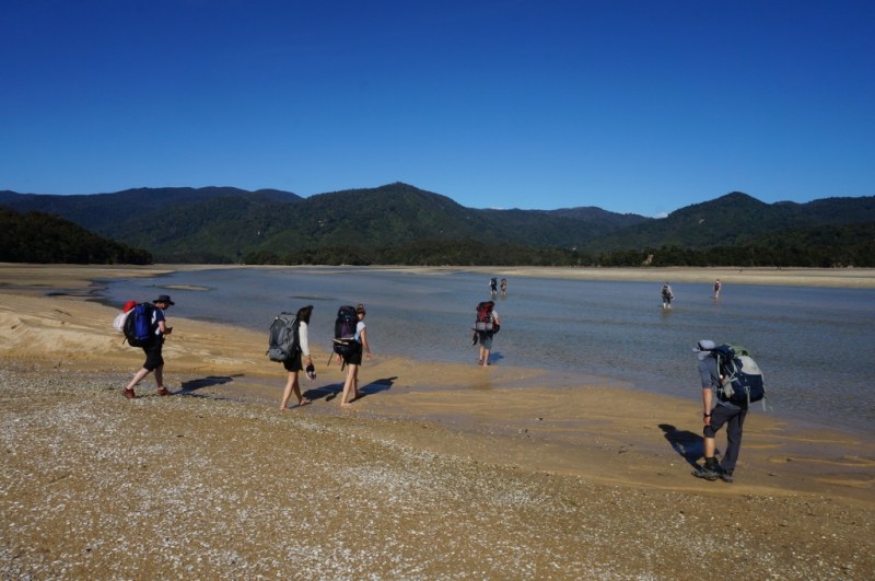 Awaroa Estuary. Stunda līdz bēgumam. Ūdens pamazām atkāpjas.