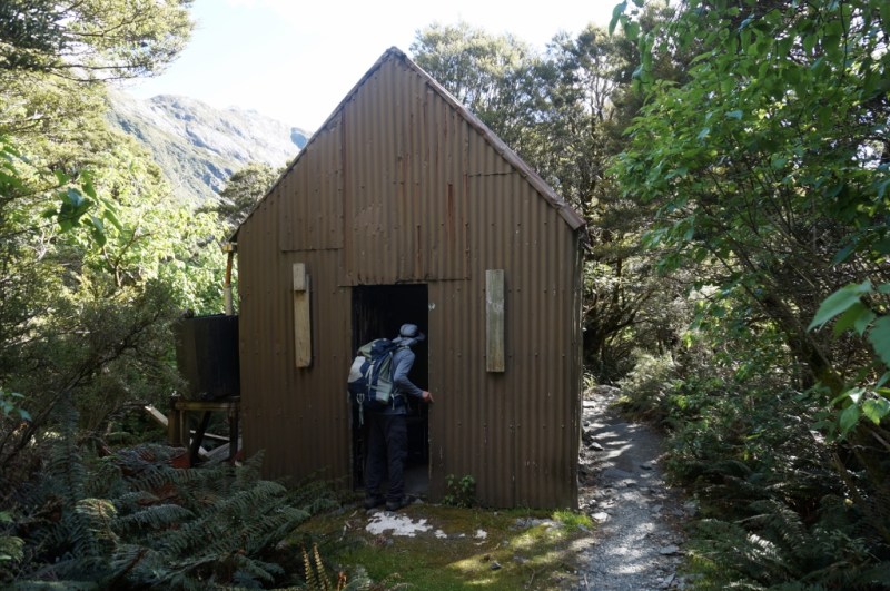 Tieši takas malā kartē neatzīmēta kalnu būdiņa ar pabriesmīgu bardaku iekšpusē. Laikam privātais hut (ar tādiem pilna Jaunzēlande), tik durvis vaļā palikušas.