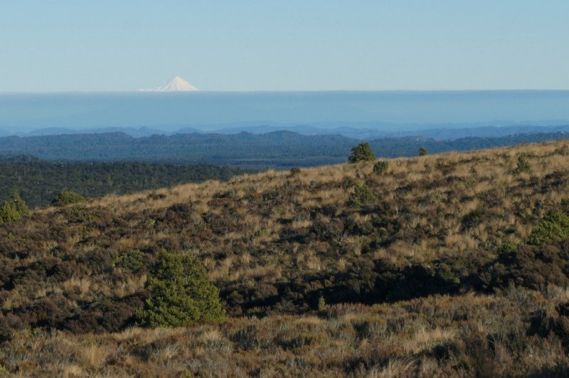Tālumā pie horizonta Taranaki vulkāns.