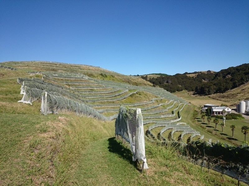 Esk Valley. Vīnogulāju rindas turpinās arī aiz kalna…