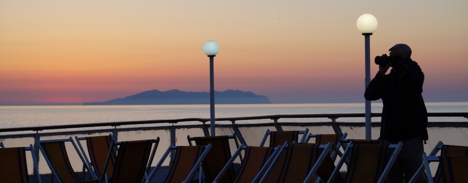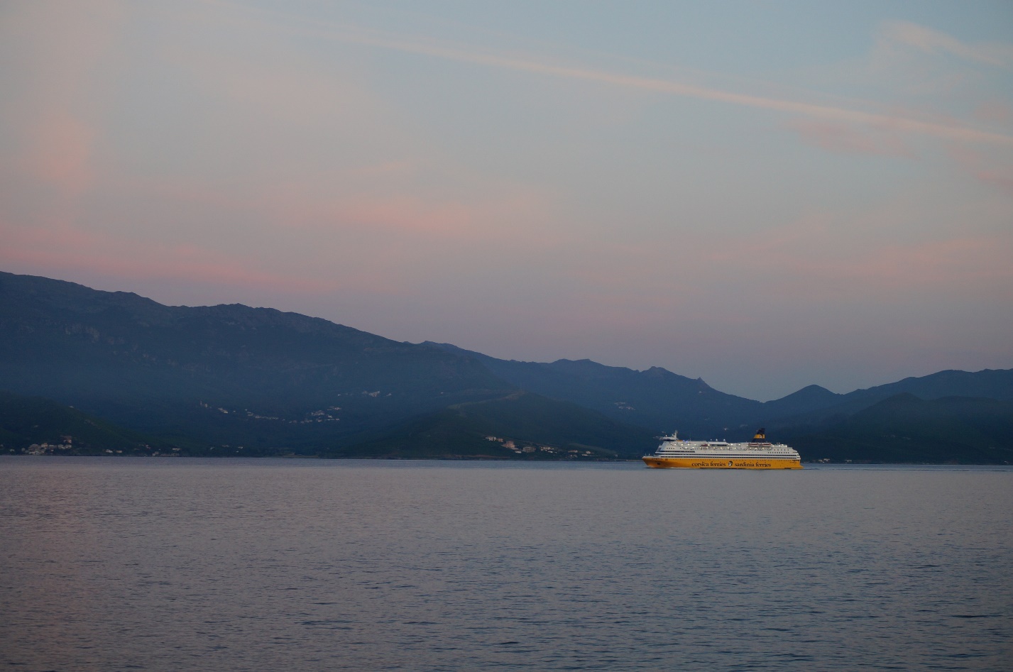 Brīnumainā kārtā prāmja gaitenī izgulējos ļoti labi. Ērti. Un samērā kluss, neskatoties uz to, ka tā bija tranzītzona starp tusiņu klāju un pārējo kuģi. Vakarā, tumsā ejot gulēt, domāju, ka esmu pie melniem stikliem. Pamostoties tie izrādījās logi. 🙂 Aiz kuriem mani sveicināja Korsikas Z pussalas gals. Brīnišķīga rītausma un saullēkts…