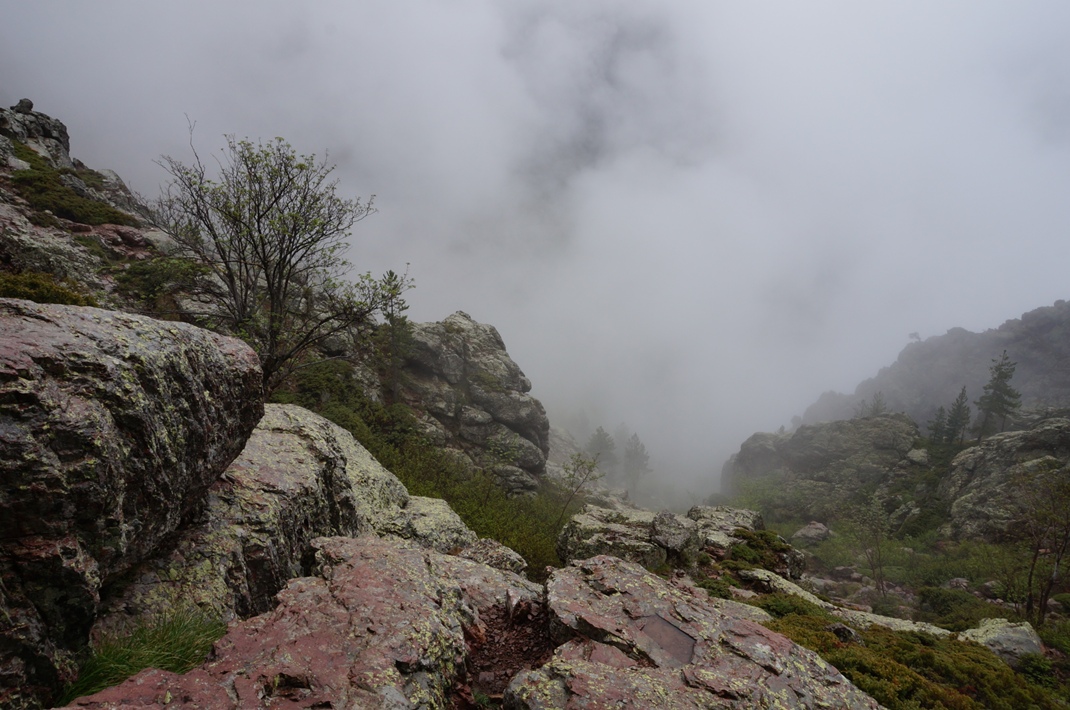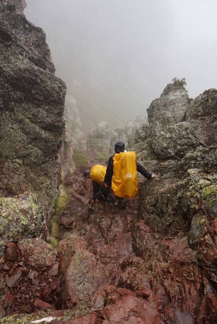 Vidusposms, kurš veda pa kalnu grēdas roboto kori, gan bija aizraujošs. Tur nemaz neprasījās pēc ainavām, jo iešana bija ļoti grūta. Migla vismaz neļāva novērst uzmanību no sarežģītās “takas”. Vairākkārt nācās izmantot rokas, lai kaut kur tiktu augšā vai lejā. Brīžiem noderēja kāpšanas treniņos gūtās iemaņas – izjūti kā labāk satvert klinti vai kā kāju nolikt… 🙂
