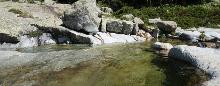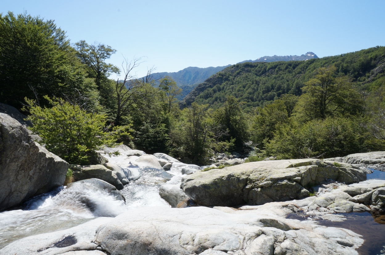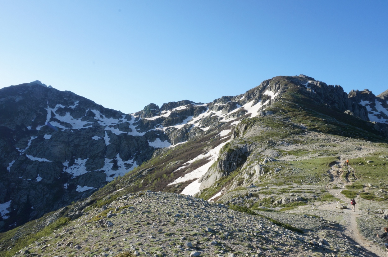 Piecēlos 6:00 un ap 6:50 jau devos ceļā. Sākums veda stāvā kalnā pa akmeņainu, brīžiem klinšainu taku. Pēc, apmēram, 1h sasniedzu krustojumu, kur GR20 veda lejā ielejā, bet dzelteni marķējumi norādīja taku uz Monte d’Oro. Sēdēju 15 minūtes un centos izlemt, ko darīt… It kā jau taka bija plus mīnus pārskatāma gandrīz līdz virsotnei, un tur nebija sniega. Radās doma uzkāpt un tad pa to pašu ceļu atpakaļ… Bet iepriekšējā vakarā Džošs man bija paskaidrojis, kā izpaužas aizliegums kāpt. Tas nozīmē, ka, ja man kaut kas notiek, tad glābēji būs dārgi jāapmaksā. Tas neskaitīsies vienkārši nelaimes gadījums. Sapratu, ka šis nu ir tas brīdis, kad jāapklusina sava dullība un jāiet prātīgais ceļš, tapēc pēc nelielas šaubīšanās tomēr devos tālāk pa GR20. Nogāze uz leju bija stāva, bet ar lieliem akmeņiem un krūmiem, tāpēc samērā viegla. Kādu 1,5 h nesos no kalna lejā labos ātrumos pat nemeklēdama, kur ved taka… Lejā pie upes to atkal uzgāju.