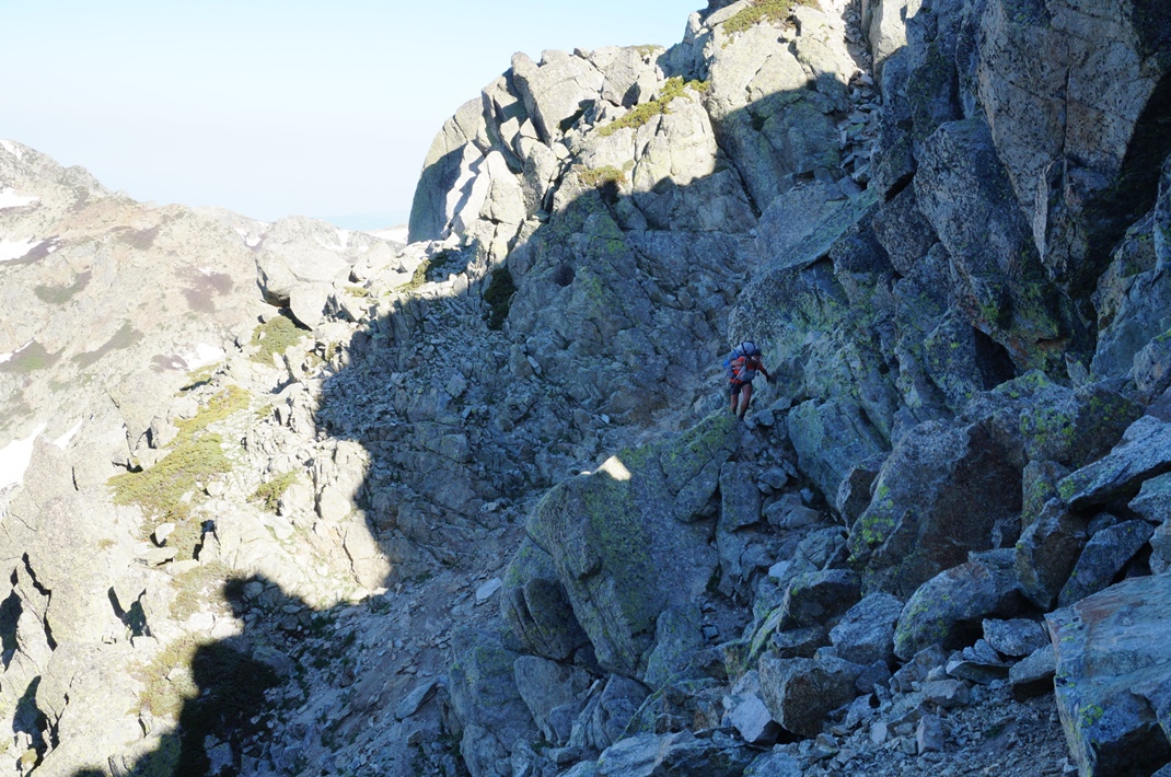 Arī lejā ejot, kaut kādā brīdī atkal pazaudējām taku… Šoreiz sniega nebija, bet pēc ilgstošas ložņāšanas un diskutēšanas Lorans nolēma doties lejā pa kādu stāvu un birstošiem akmeņiem pilnu kuluāru starp stāvām klintīm. Kad veiksmīgi bijā šo pievarējuši, puiši atkal pamanīja normāli ejamu īsto taku klintij pa otru pusi… 😀