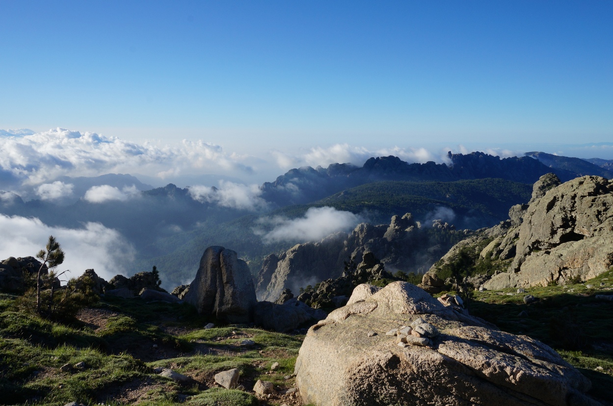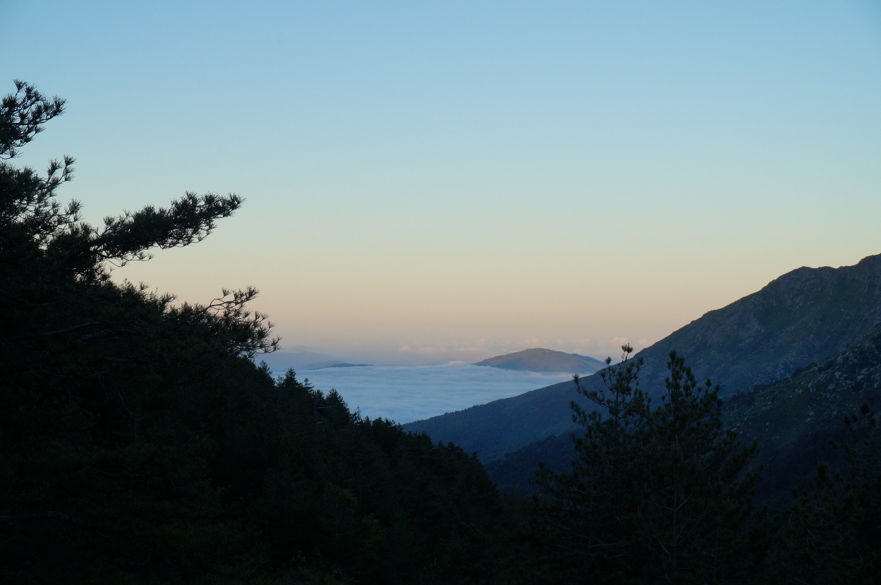 Sāku iet pirmā līdz ar pirmo, mazo gaismiņu. Sākumā taka veda cauri smukam mežam ar dzelteniem krūmiņiem. Gāju un dvēsele gavilēja no tik skaista rīta… 🙂 Pēc ~1h nonācu krustojumā, kur GR20 veda tālāk pa mežu apkārt klinšu kalnu grēdai. Bet “dzeltenā” taka veda pāri. Jau iepriekš biju noskatījusi šo taku. Gribējās vēl izmantot iespēju no ~1000m uzkāpt līdz 1600m… Un to tagad nenožēloju ne mirkli. Protams, ~1h smagais kāpiens nebija viegls. Bet augšā… Beidzot mani apspīdēja šī rīta saule, un ieleja vēl bija tīta mākoņos… Es atrados virs zeltainiem mākoņiem!!!! Stāvēju dziļi aizgrābta no tāda skaistuma!!!!
