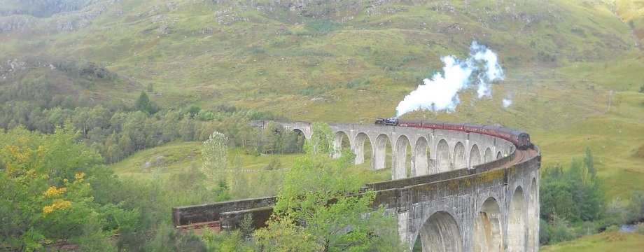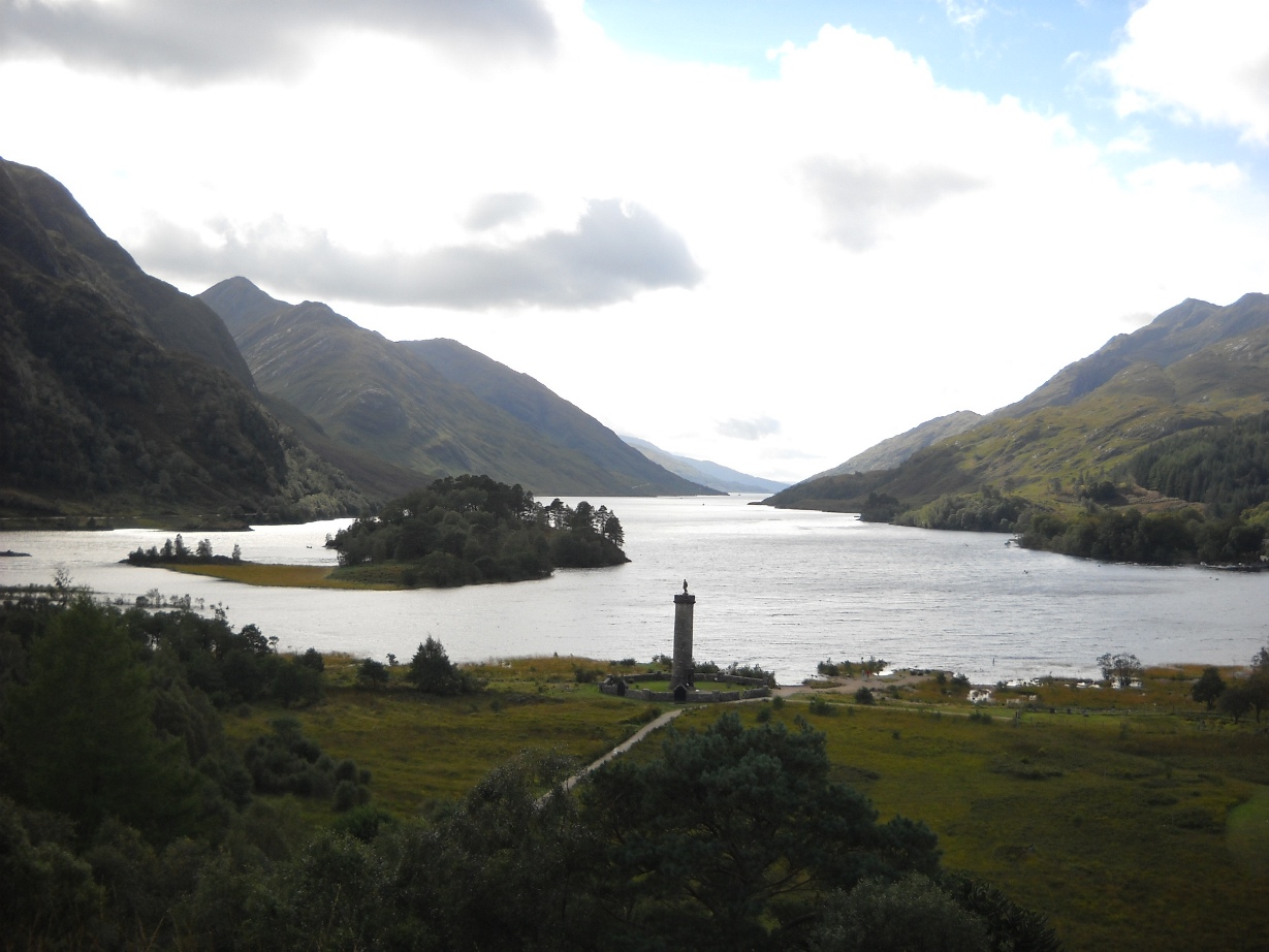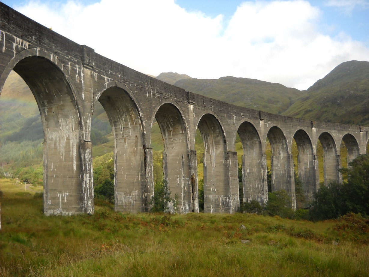 Izpētot dažādus bukletus, izlēmu doties tālāk uz ziemeļiem, uz Isle of Skye, kas ir ievērojama ar savu dabas ainavu. Pusceļā uz Mallaig nolēmu izkāpt arī Glenfinnan, lai aplūkotu Jakobītu pieminekli. Šajā vietā 1745.gadā krastā esot izcēlies viens no Skotijas brīvības cīnītājiem – Čārlzs Edvards Stjuarts. Kārtīgi no visām pusēm apskatīju arī iespaidīgo 30 metrus augsto Glenfinnan viaduktu, kurš esot bieži redzams filmās par Hariju Poteru. Tas ir būvēts ap 1900.gadu. Pie viadukta gadījās trāpīties tieši uz to laiku, kad atpakaļ no Mallaig nāk Jakobītu vilciens (veco laiku lokomotīve, kas velk veco laiku vagonus). Skaisti! Tieši viadukta vidū lokomotīve izlaida garu signālu un izkūpināja gaisā baltus dūmu mutuļus. Uz brīdi iztēlē varēja nonākt 100 gadu tālā pagātnē… 🙂