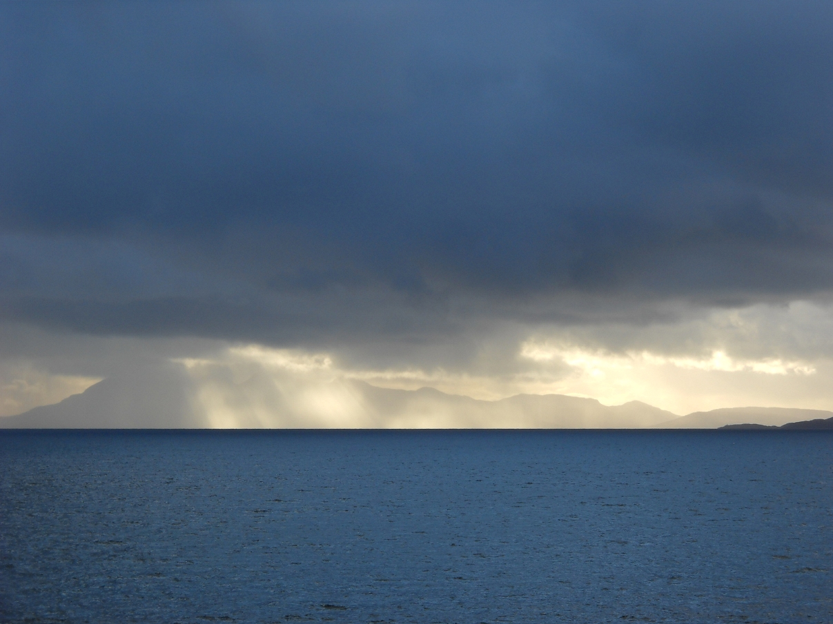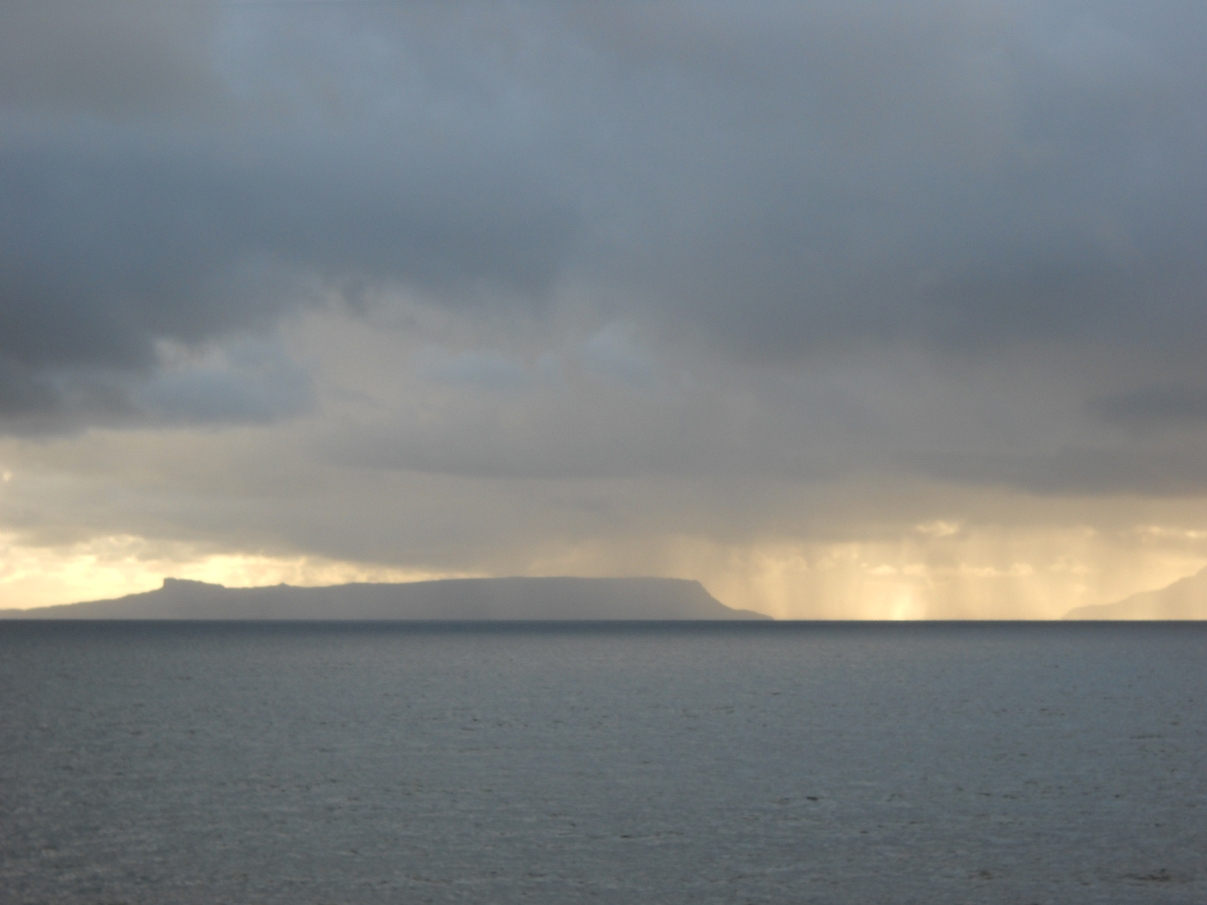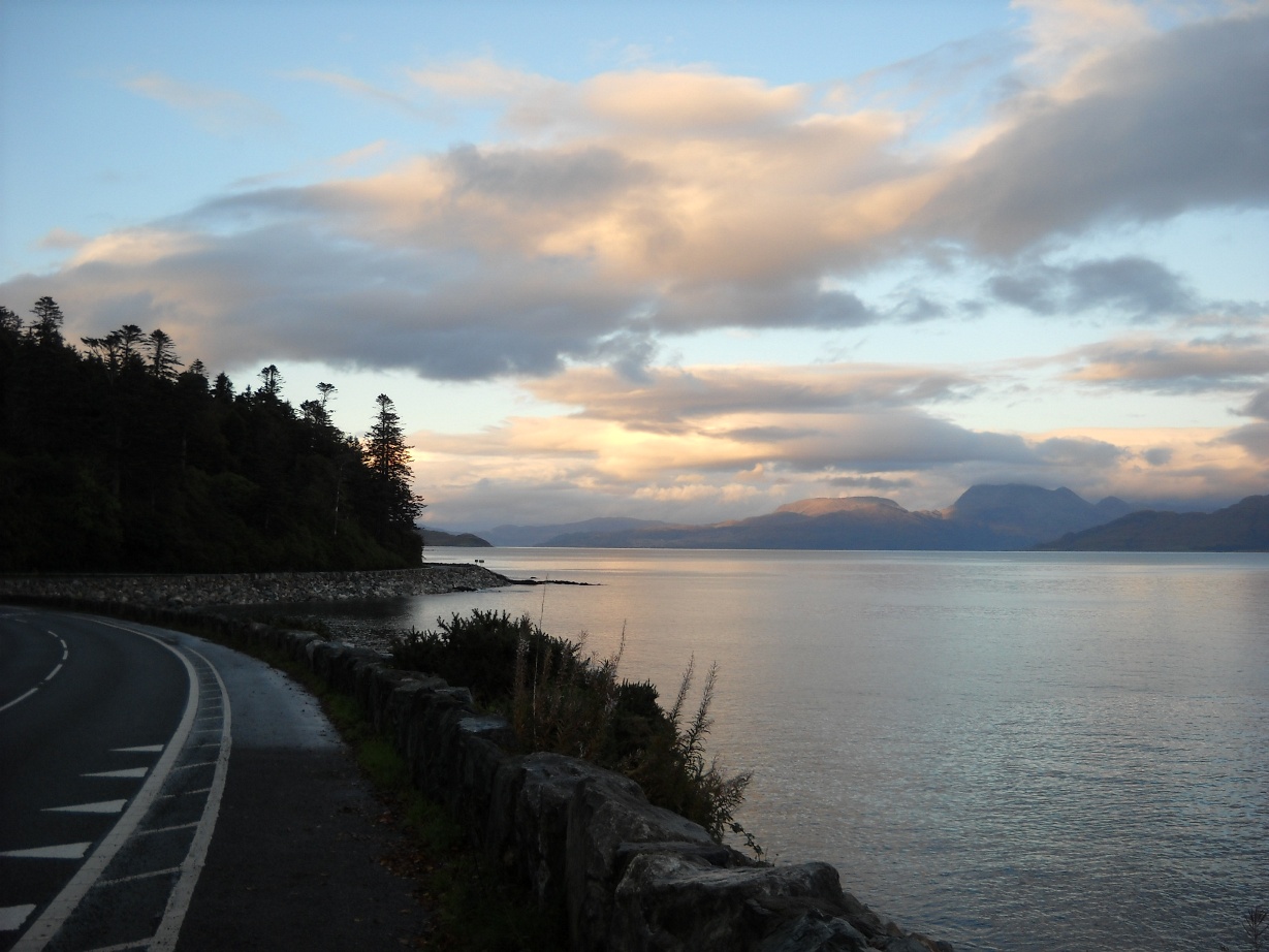 Nolēmu iesākumā aizstaigāt turpat uz 1 km attālo Armadale pili. Tur uzzināju, ka ieeja pils dārzos, muzejā un pie pilsdrupām bija vaļā nākošajā rītā no 9:30. Bet tā kā man kājas niezēja uz staigāšanu (šajā dienā nebiju paspējusi nogurt), nolēmu tomēr izlaist šīs pils apskati un doties gar šoseju Knock pils virzienā. Lietus bija pazudis, un šoseja vijās tieši gar akmeņainu krastu. Fantastiskas ainavas un saulrieta debesis virs mazajām saliņām…
